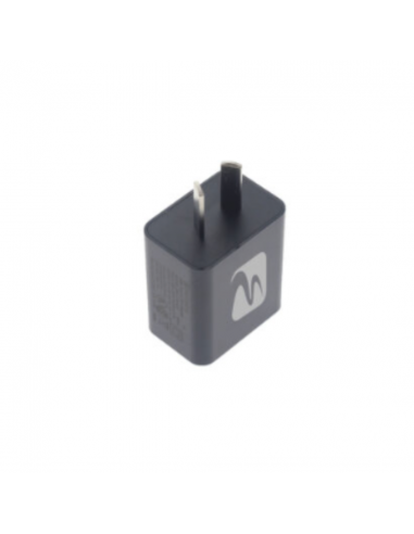 Un Cargador de pared contacto con tecnologia de carga rapida de 20 W. Cuenta con doble salida, un puerto USB-C y un puerto USB-A, ofreciendo voltajes de salida de 5V, 9V y 12V, ideal para dispositivos móviles, smartphones y tablets con carga rápida. Es portátil, de color negro y compatible con diversas marcas.